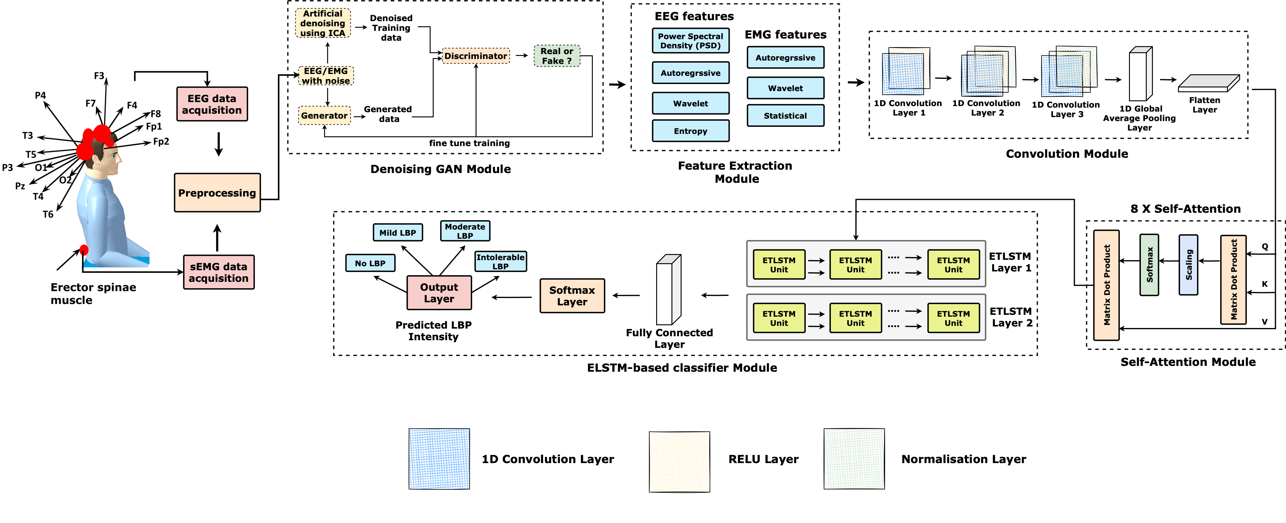Low Back Pain (LBP) is the most prevalent musculoskeletal condition worldwide and a leading cause of disability, significantly affecting mobility, work productivity, and overall quality of life. Due to its high prevalence and substantial economic burden, LBP presents a critical global public health challenge that demands innovative diagnostic and therapeutic solutions. This study introduces a novel deep-learning approach for diagnosing LBP intensity using electroencephalography (EEG) signals and surface electromyography (sEMG) signals from back muscles. A GAN-Convolution-Transformer-based model, named GLEAM (GAN-ConvoLution-sElf Attention-ETLSTM), is designed to classify LBP intensity into four categories: no LBP, mild LBP, moderate LBP, and intolerable LBP. A denoising GAN is central to the model’s functionality, playing a pivotal role in enhancing the quality of EEG and sEMG signals by removing noise, resulting in cleaner and more accurate input data. Various features are extracted from the GAN-denoised EEG and sEMG signals, and the combined features from both EEG and sEMG are used for LBP detection. After the feature extraction, the CNN is employed to capture local temporal patterns within the data, allowing the model to focus on smaller, region-specific trends in the signals. Subsequently, the self-attention module identifies global correlations among these locally extracted features, enhancing the model’s ability to recognize broader patterns. The proposed ETLSTM network performs the final classification, which achieves an impressive LBP detection accuracy of 98.95%. This research presents several innovative contributions: (i) the development of a novel denoising GAN for cleaning EEG and sEMG signals, (ii) the design and integration of a new ETLSTM architecture as a classifier within the GLEAM model, and (iii) the introduction of the GLEAM hybrid deep learning framework, which enables robust and reliable LBP intensity assessment.