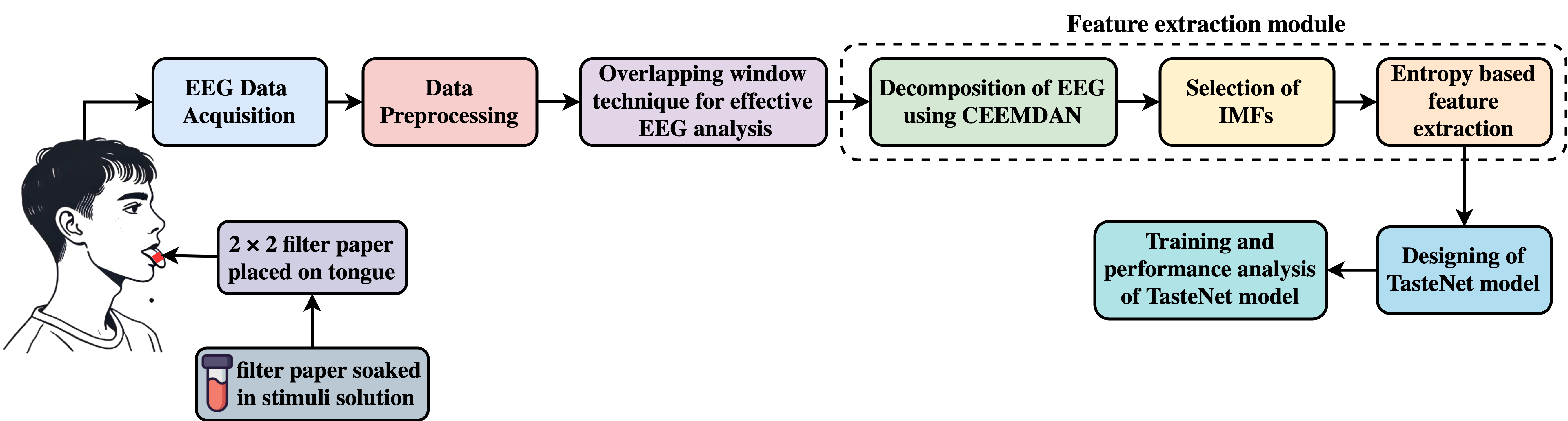 Taste perception is the process by which the gustatory system detects and interprets chemical stimuli from food and beverages, involving activation of taste receptors on the tongue. Analyzing taste perception is essential for understanding human sensory responses and diagnosing taste-related disorders. This research focuses on developing a deep learning framework to effectively recognize basic taste stimuli from EEG signals. Initially, the recorded EEG signals undergo preprocessing to remove noise and artifacts. The CEEMDAN (complete ensemble empirical mode decomposition with adaptive noise) method is then applied to decompose the EEG signals into various frequency rhythms, referred to as intrinsic mode functions (IMFs). From the chosen IMFs, six distinct entropy features — sample, bubble, approximate, dispersion, slope, and permutation entropy — are extracted for further analysis. A novel deep learning model, TasteNet, is then developed, integrating a convolutional neural network (CNN) module, a multi-head attention module, and the Att-BiPLSTM (Attention-Bidirectional Potent Long Short-Term Memory) network. The proposed architecture classifies the input data into six categories: no taste, sweet, sour, bitter, umami, and salty, achieving a remarkable accuracy of 97.52 ± 0.48%. TasteNet outperforms existing taste perception classification methods, as demonstrated through extensive experiments. This study presents TasteNet, a robust framework for precise taste perception recognition using EEG signals. Using CEEMDAN for effective signal decomposition and extracting key entropy features, the model captures intricate patterns in taste stimuli. The incorporation of multi-head attention module and the Att-BiPLSTM network further enhances the model’s ability to identify various taste sensations accurately.